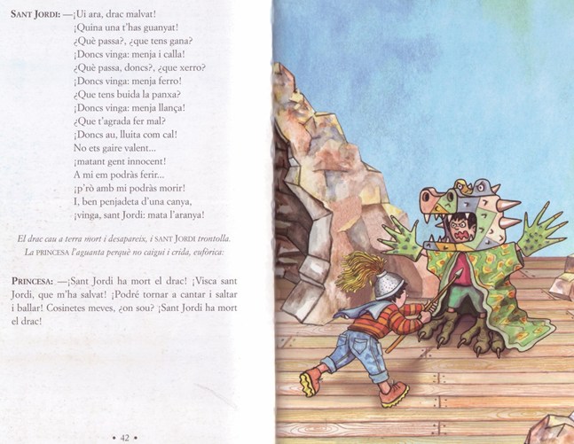 La meva divertida obra de teatre per a vint-i-cinc alumnes de primària La llegenda de sant Jordi es basa en la llegenda tradicional, però també en la societat actual. Aquesta barreja de saviesa antiga i vida moderna fa que les meves obres facin pensar, riure… i respirar fondo
